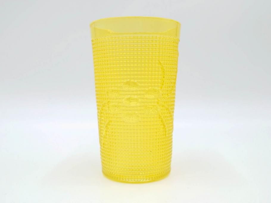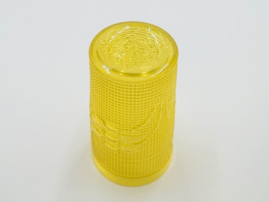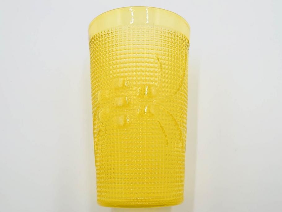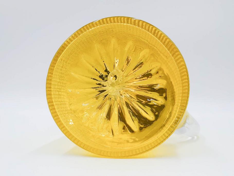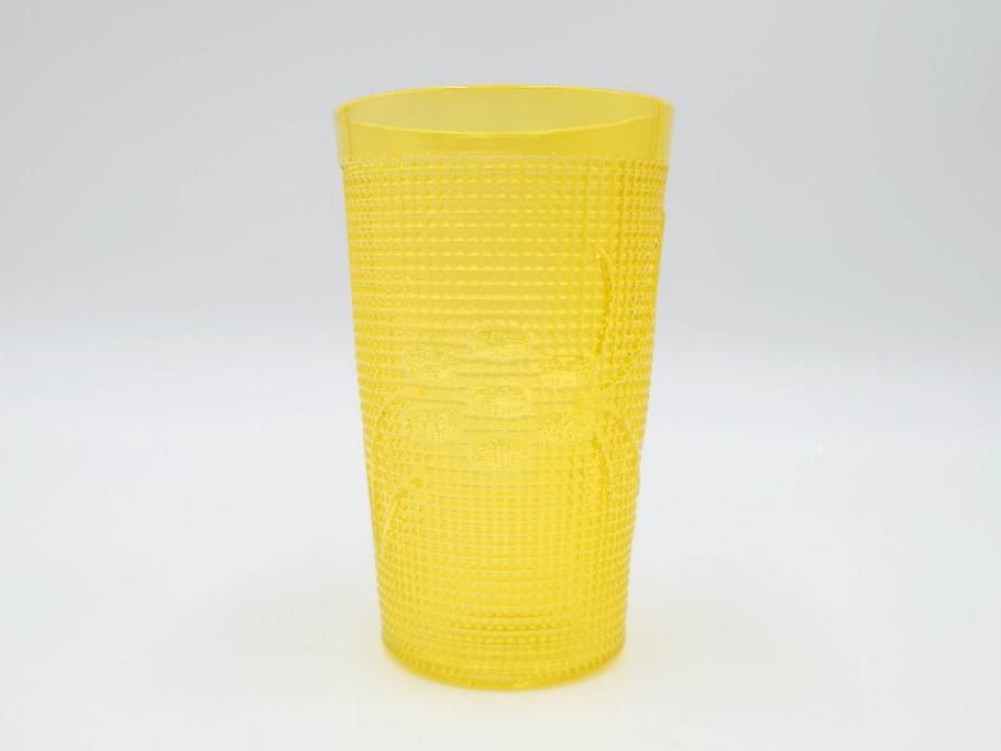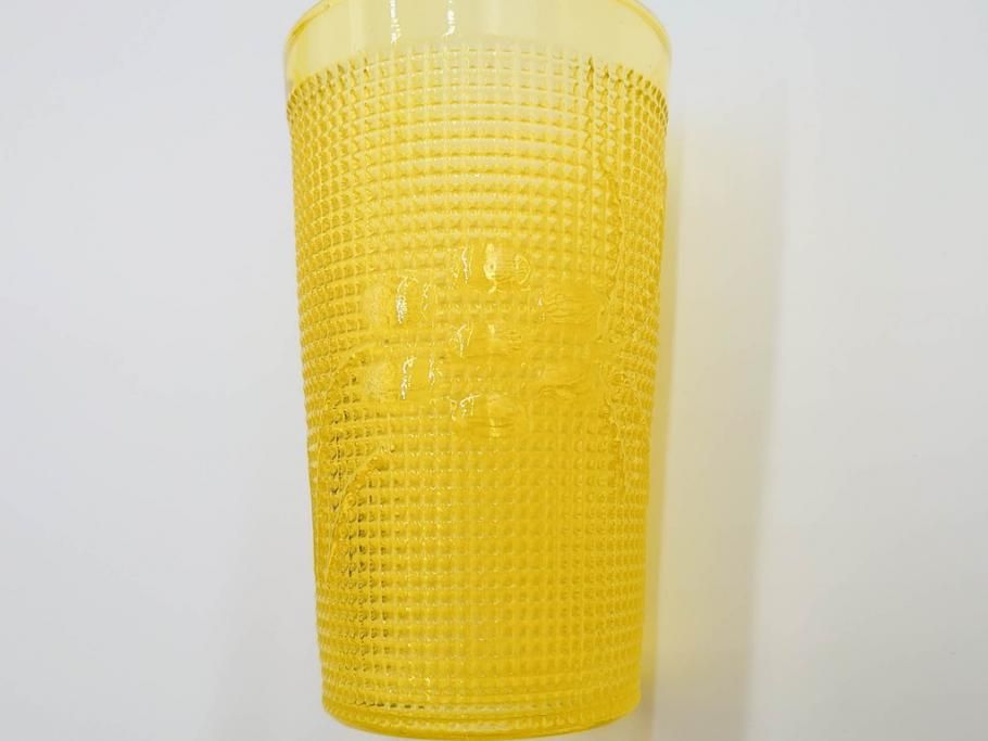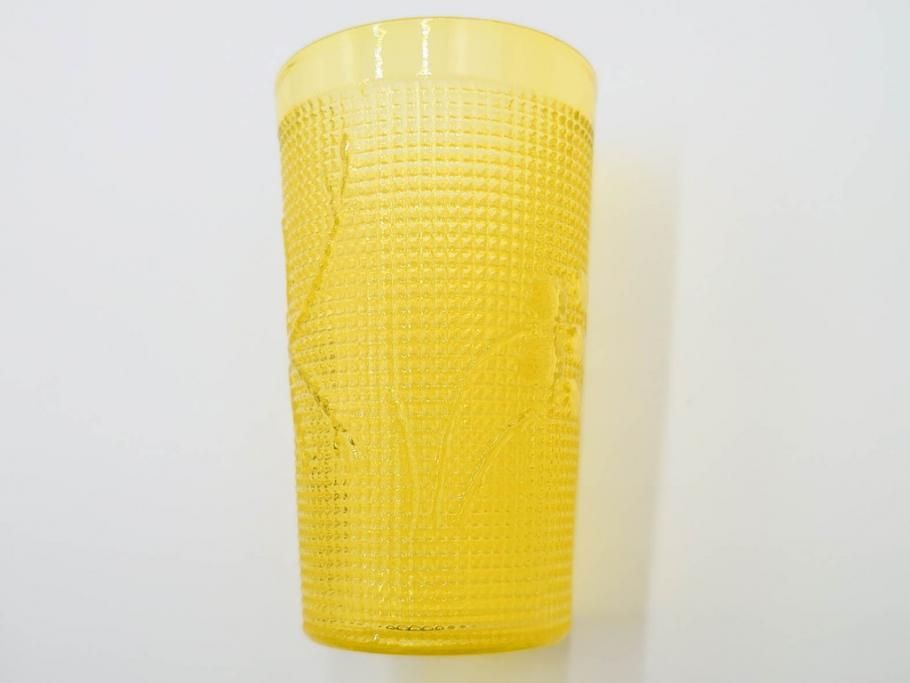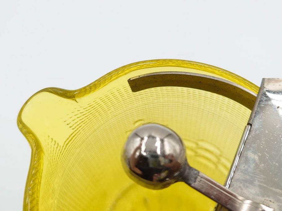 大正〜昭和初期 花文 黄色 ガラス 鮮やかな色合いが食卓に明るさと個性を添える水差し&コップ2客セット(硝子、ジャグ、蓋付き、魚子、ピッチャー、グラス、和ガラス)(R-083565)