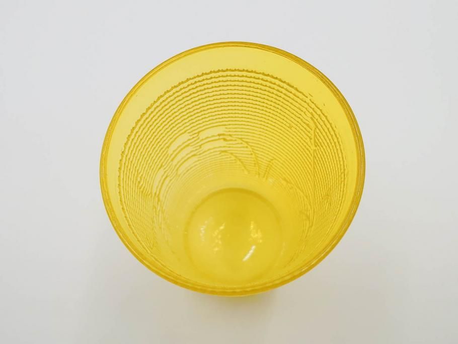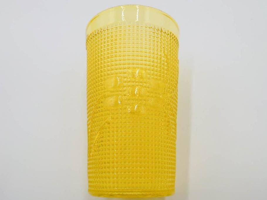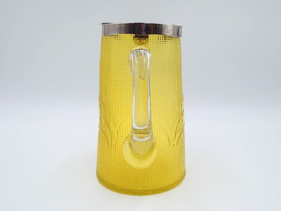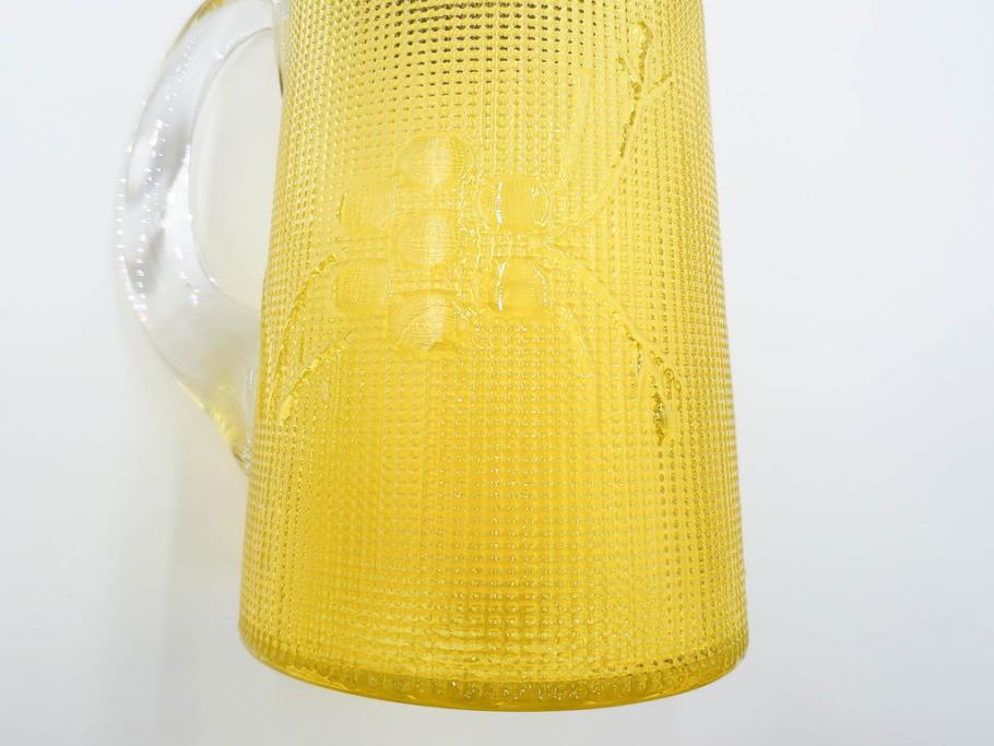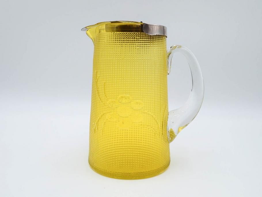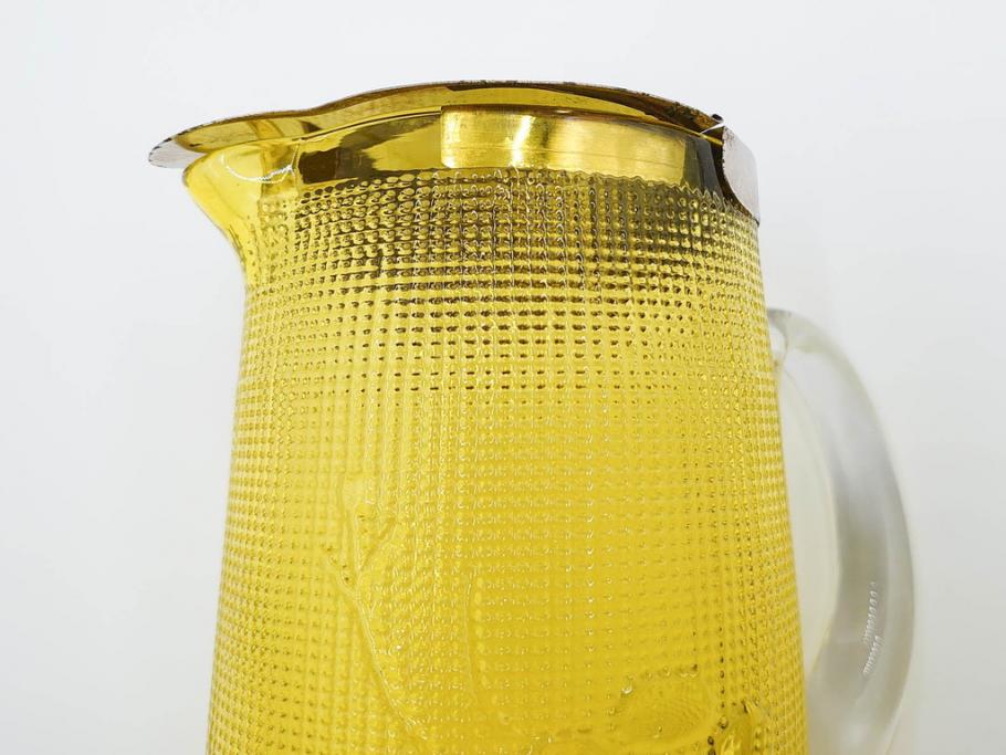 ラフジュ工房> 骨董・美術品> 骨董-ガラス食器 > 大正〜昭和初期 花文 黄色 ガラス 鮮やかな色合いが食卓に明るさと個性を添える水差し&コップ2客セット(硝子、ジャグ、蓋付き、魚子、ピッチャー、グラス、和ガラス)(R-083565)