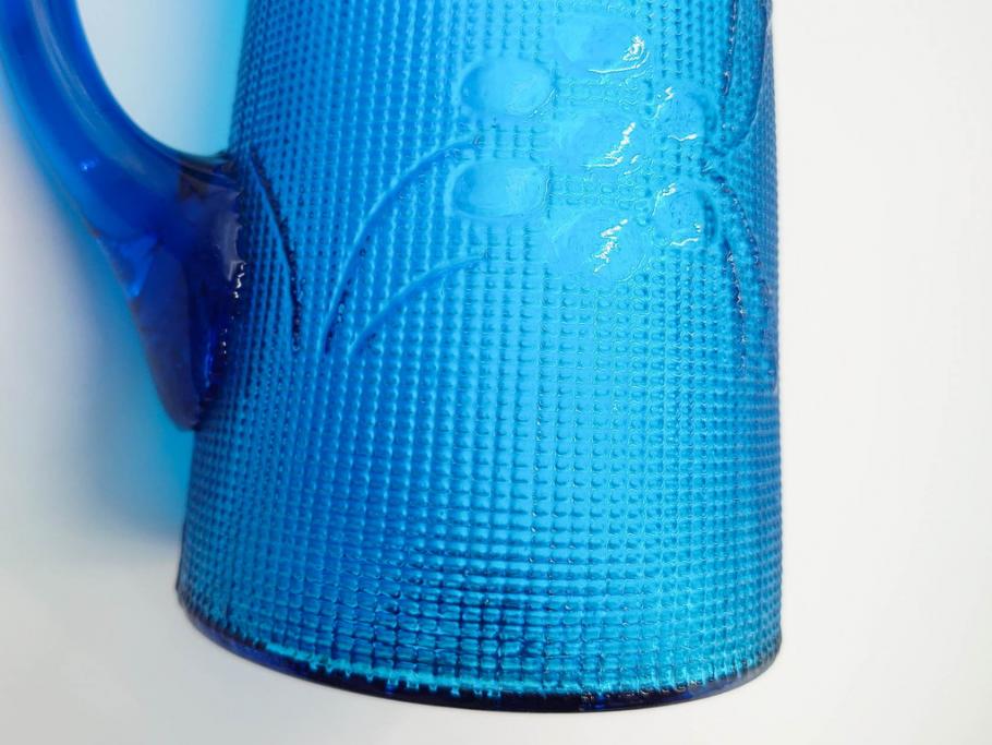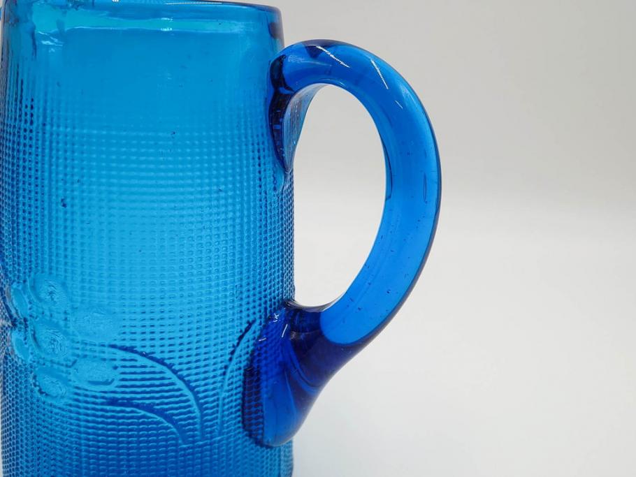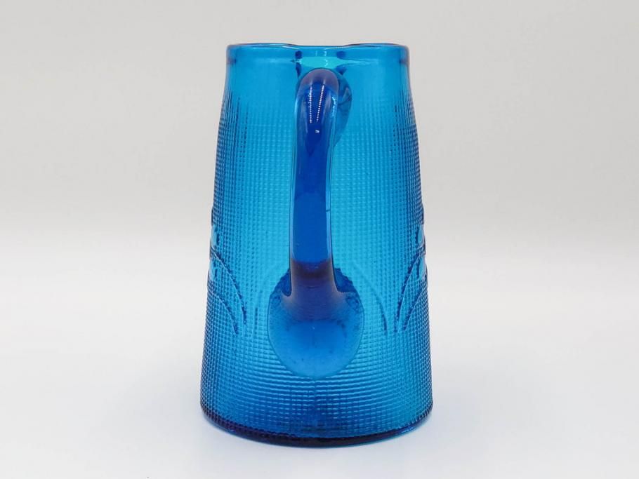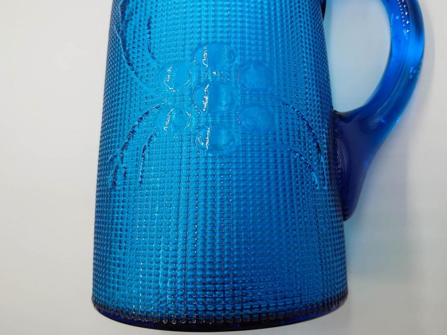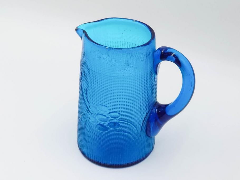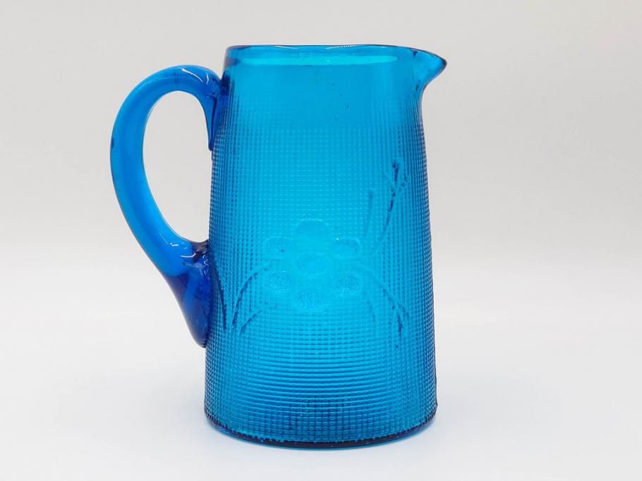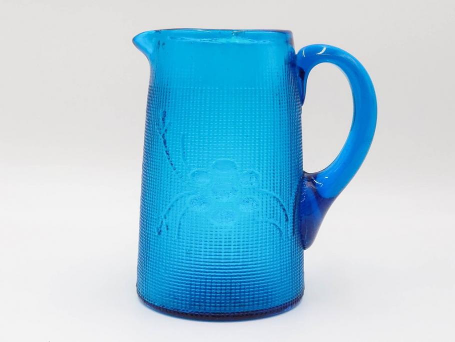 ラフジュ工房> 骨董・美術品> 骨董-ガラス食器 > 大正〜昭和初期 花文 青色 ガラス 鮮明な色彩がインテリアとしても存在感を放つ水差し(硝子、ジャグ、魚子、ピッチャー、和ガラス)(R-083567)