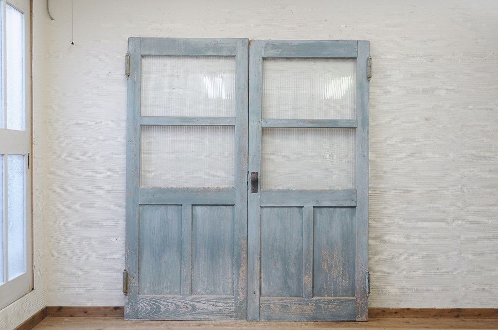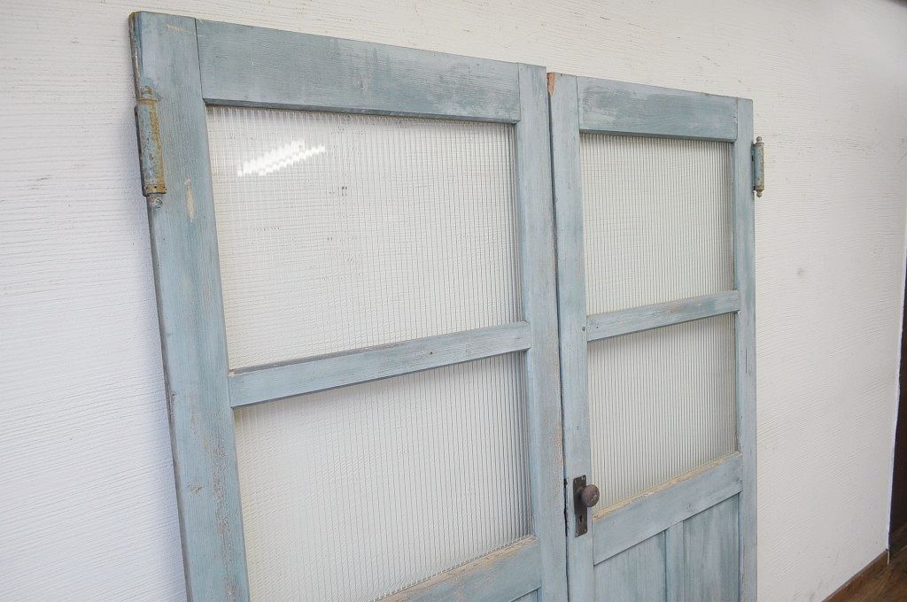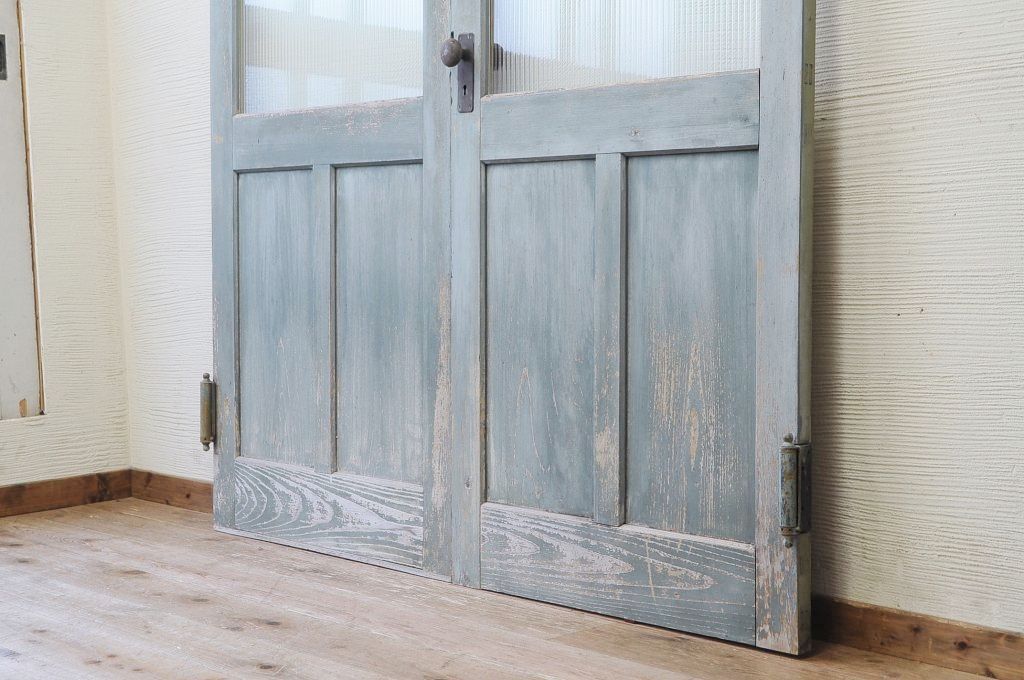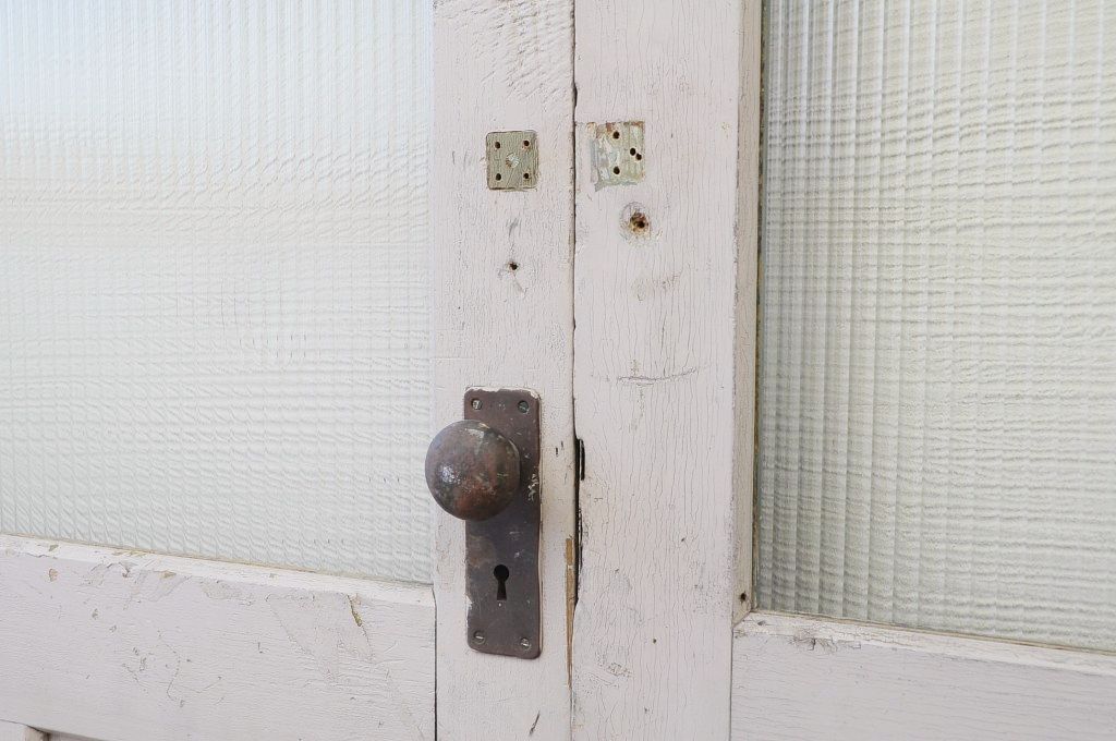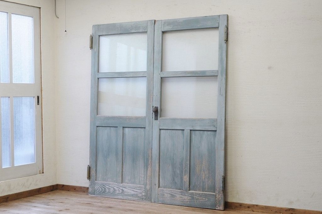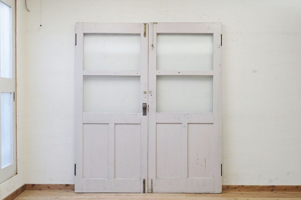 ペンキの剥げた大振りなモールガラス両開きドア(扉)一対
