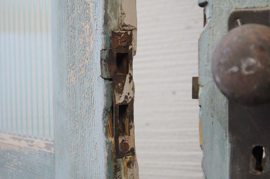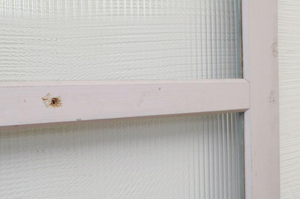 ペンキの剥げた大振りなモールガラス両開きドア(扉)一対です。